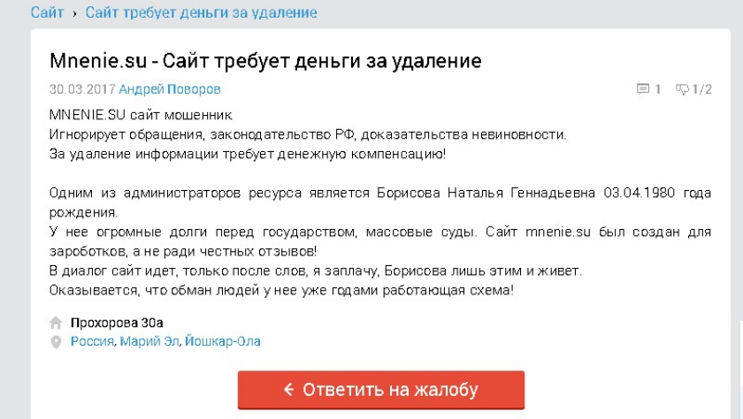 Андрей Поворов жалуется на сайт Mnenie.su. Он обращался в администрацию портала, писал официальные письма, предъявлял доказательства деловой честности, ссылался на закон. Ничего не помогло. Руководство сайта все твердило своё: дайте денег!