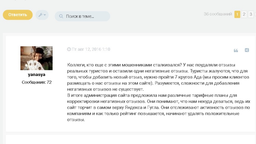Ситуация встречается нередко. Например, про сайт Отзовик владелец турфирмы пишет, что администрация удалила реальные положительные отзывы туристов и понаписала фейковых негативных. Руководство портала предложило решить проблему за подписку на платные тарифные планы.