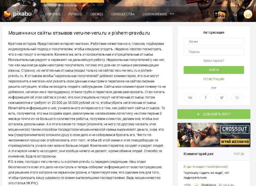 Отзывы живых пользователей им погоды не делают. Администраторы таких сайтов мониторят сеть, составляют списки молодых бизнесов. Сами пишут на них клеветнические отзывы. А возмущенным начинающим предпринимателям предлагают решить вопрос за умеренную плату.