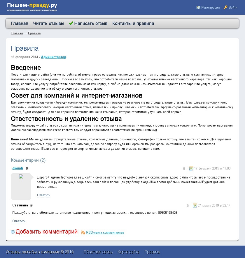 Пример 1. На сайте Пишем-правду.ру нет пользовательского соглашения, политики конфиденциальности. Правила как — бы есть, но в них вообще не описаны требования к авторам. Пиши что хочешь, дорогой кляузник! А кому не нравится, можете судиться.