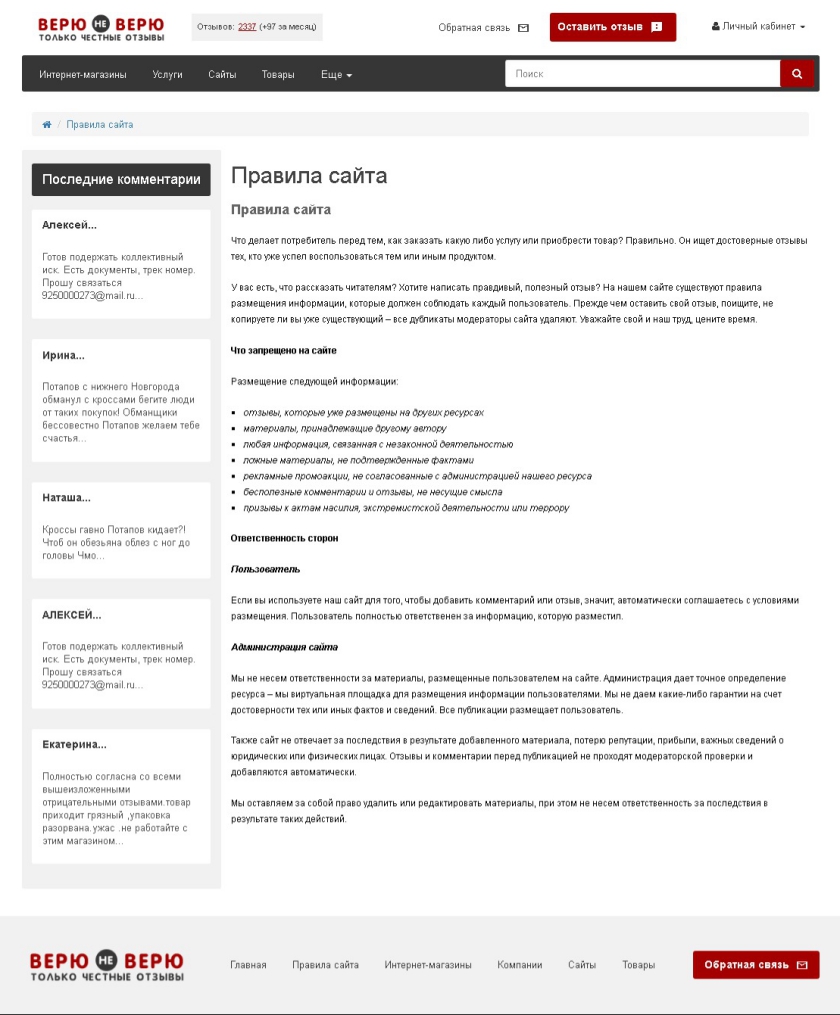 Всевозможных отзовиков сотни. Проверять их объективность на реальных покупках не хватит ни денег, ни времени. Для предварительной оценки заглянем в официальные правила сайтов. Пользовательские соглашения, положения о конфиденциальности, порядок ответственности за нарушение законодательства, правила создания и удаления отзывов.